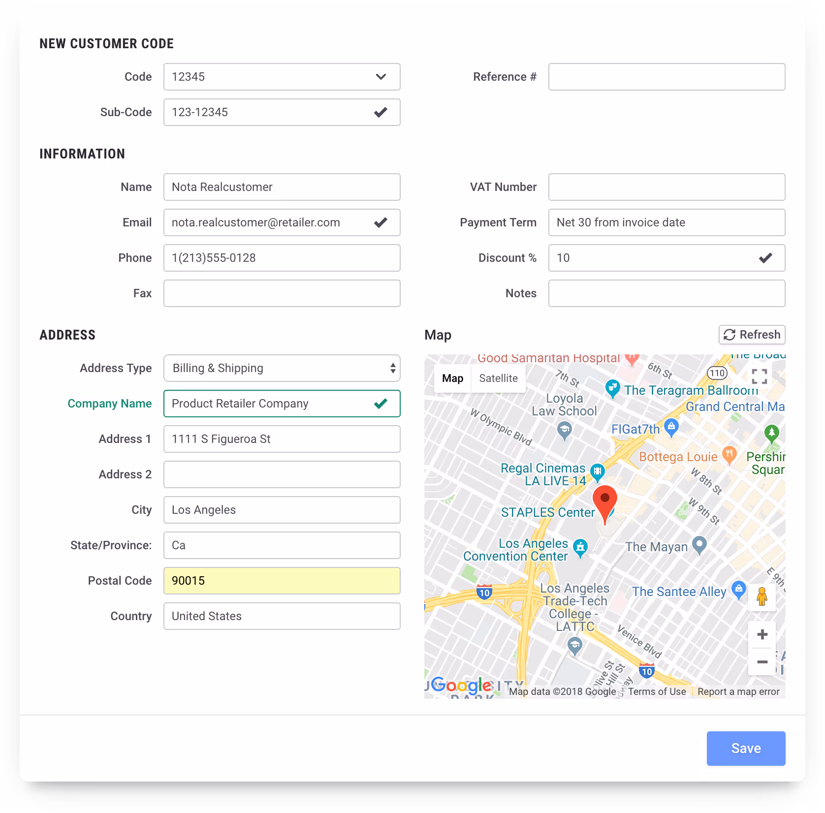 Store your terms, billing, shipping, discount, and vat number information for your customers. Create customer subcodes for customers with multiple addresses.