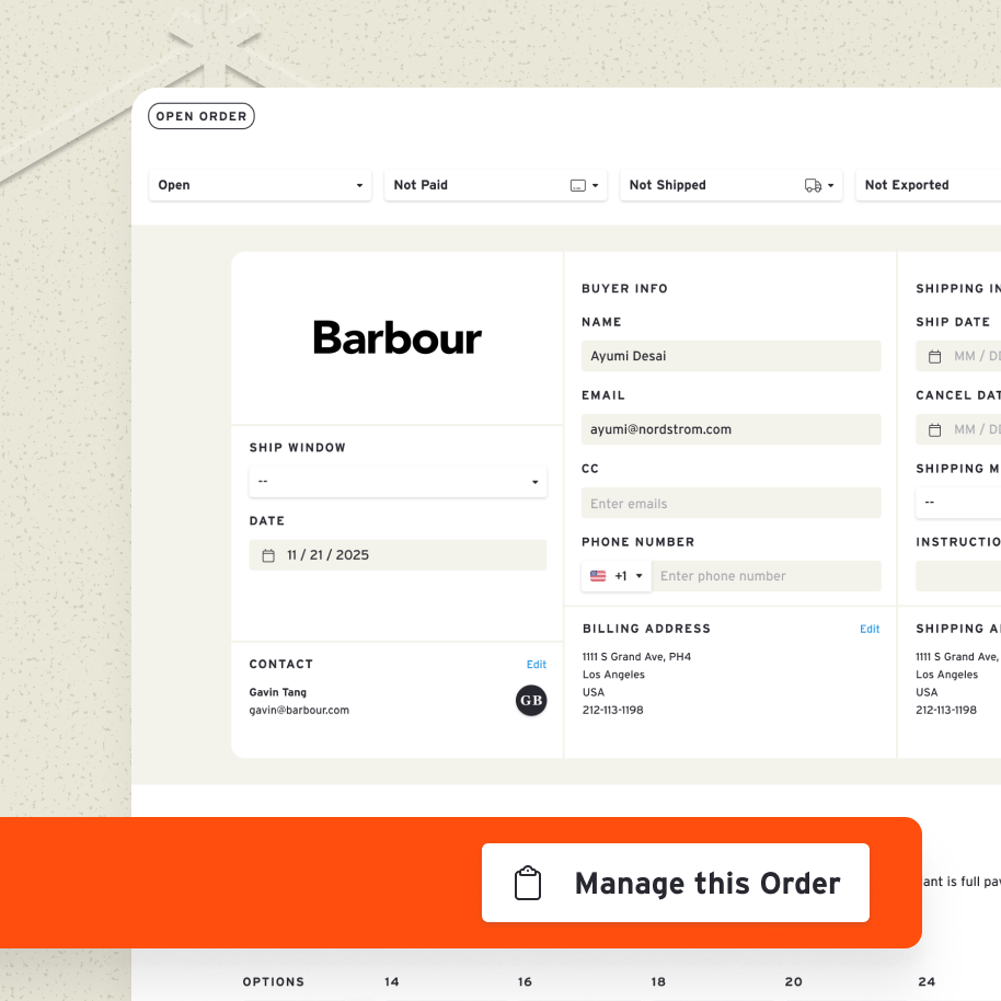 Buyers and sellers edit the same order before and after it's placed. Need to swap a size? Adjust quantities? Add a style? There’s one source of truth — no email chains, no version confusion.