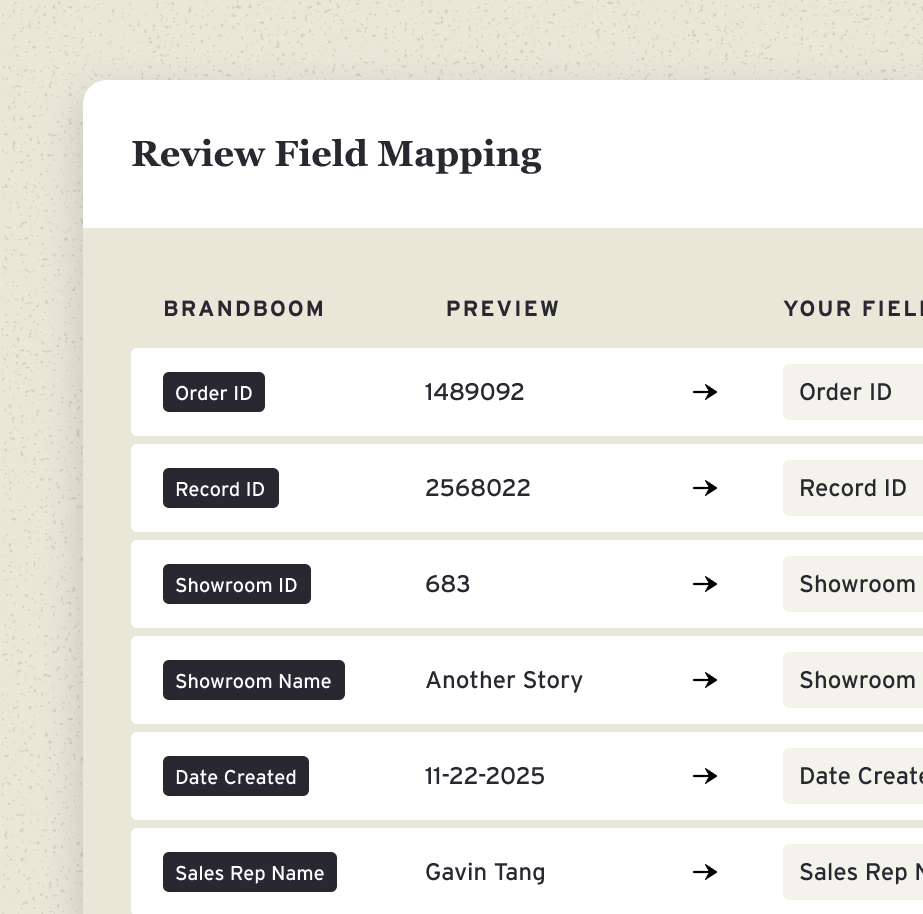 Brandboom integrates natively with Shopify and ApparelMagic. Brandboom can integrate with your ERP in days or weeks either through file drops and API. Many brands use Shopify as their source of truth and sync between Shopify and their ERP. If you're unsure whether your system will connect, reach out and we'll help you figure out the best setup.